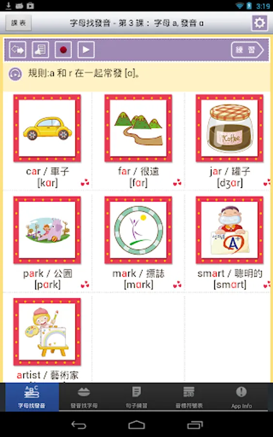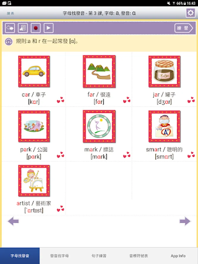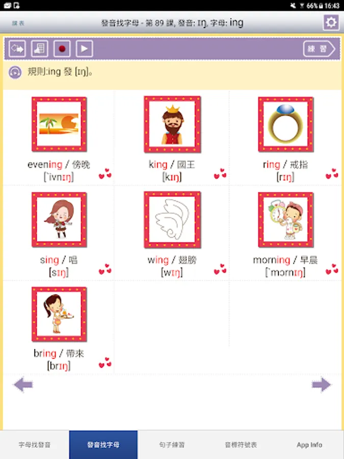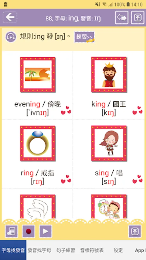 由發音找出對應的字母 (組合) 和常用單字,並說明各種特殊發音規則。