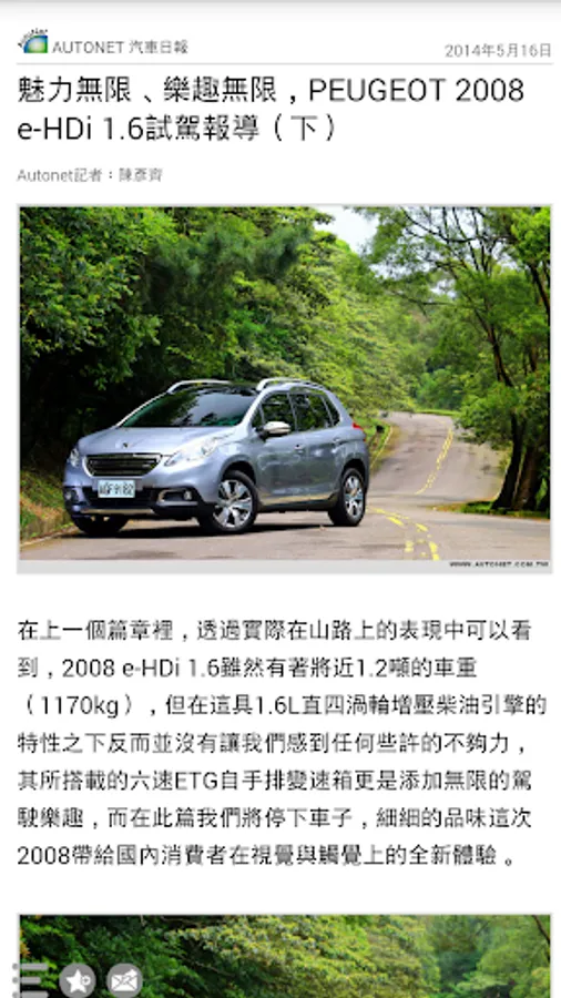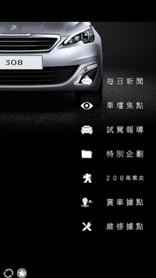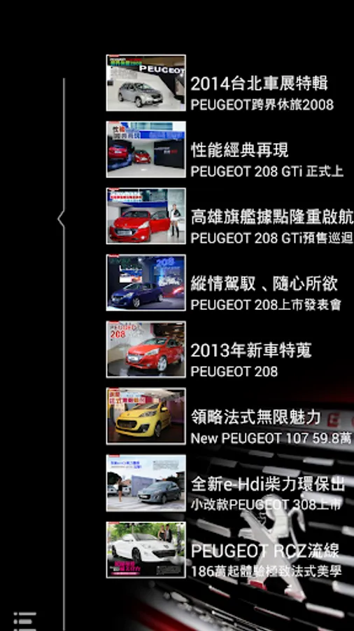 秉持著提供車迷更多元且即時的訊息,推出PEUGEOT News App,不定時更新第一手最熱門有關PEUGEOT汽車品牌的相關訊息與新聞,讓喜愛的PEUGEOT品牌的車迷朋友能夠掌握任何的最新動向,不只方便瀏覽,更可建立個人書籤,並透過Mail即時分享給同好、好友。結合智慧型手持裝置的便利優勢,結合影音、導航、電子書等豐富功能,提供據點查詢、車款型錄、專題報導等品牌相關資訊,滿足車迷們對於PEUGEOT品牌所有知性的需求。