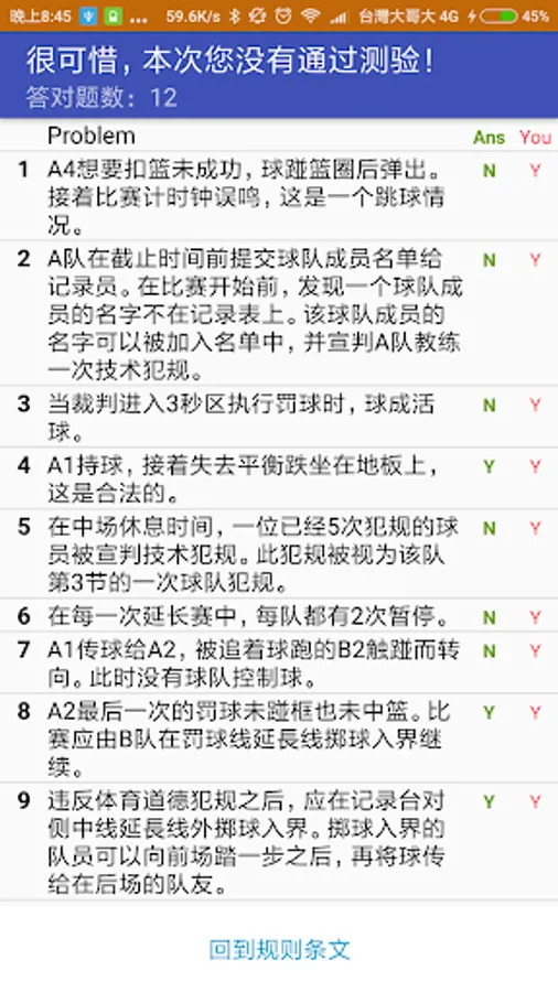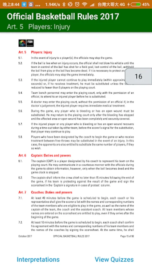 Integration of basketball rules, rules of basketball-related decisions and the actual quizzes app