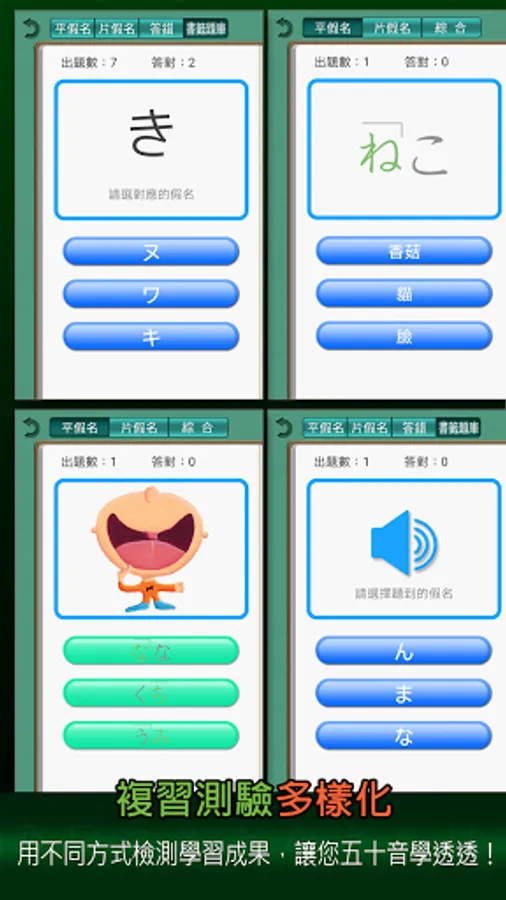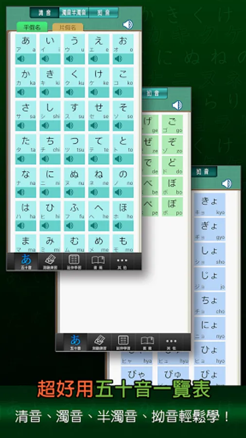 "Easy Learning of Fifty Tones" allows you to use associations, and use both hands, eyes, and ears to quickly memorize the Fifty Tones in a short period of time, and you will never forget it, so that learning Japanese has the best start!