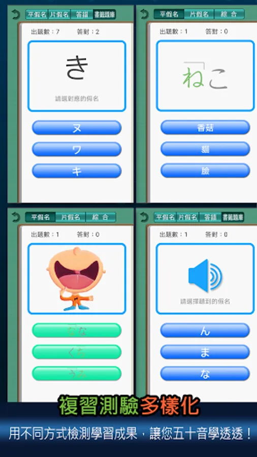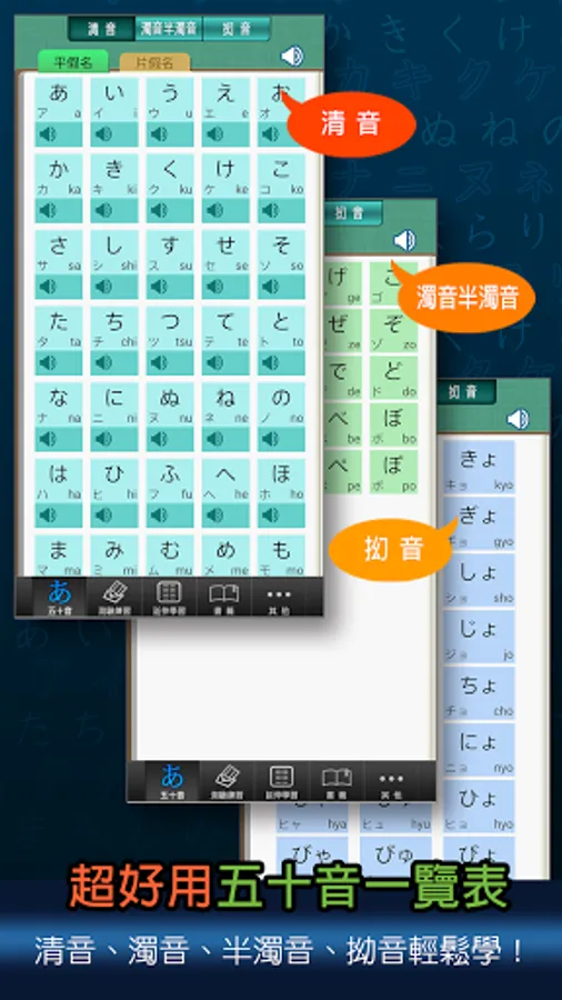 "Easy Learning of Fifty Tones" allows you to use associations, and use both hands, eyes, and ears to quickly memorize the Fifty Tones in a short period of time, and you will never forget it, so that learning Japanese has the best start!