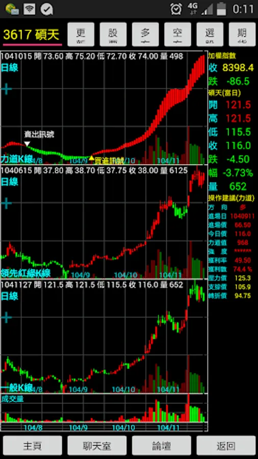 有效避免逆勢操作,進而順勢獲利,賺大賠小!本系統是近五年來最新興的交易方法,利用28種技術分析工具、基本分析模型、商品價格波動特性及週期及其他邏輯思考訊息,做為研判趨勢變動方向以及進出場的依據,並整合成簡單明瞭的多空力道K線(紅色表示多方趨勢,綠色表示空方趨勢)。長期操作可有效達成賺大賠小穩定獲利的目的,已排除人為或主觀的判斷模式,避免暴露人性四大心理錯誤:『做對不敢看』、『做錯一直看』、『看對不敢做』、『看錯一直做』。長期操作,必能賺大賠小,達到穩定獲利的目的。
