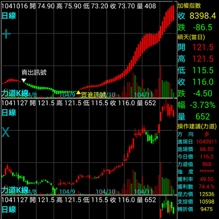 股票王、期指王-力道K線+主力曲線,可簡單清楚的幫助投資朋友瞭解每支個股目前多空方向