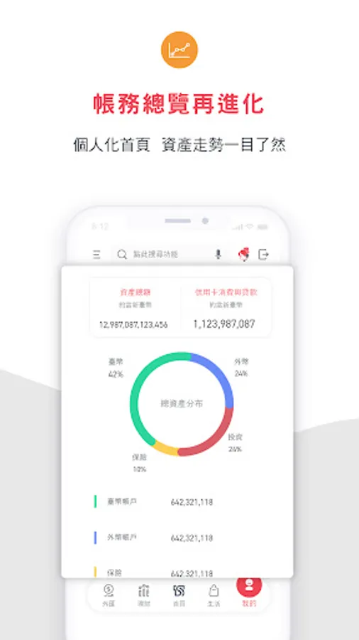 4. [Personal asset distribution and quick preview]: For you to clearly calculate the amount and proportion of various types of assets, the graphical display is clear at a glance, and you can also gently pull down on the main home page, and you can see the hidden version of the asset amount without logging in Oh!