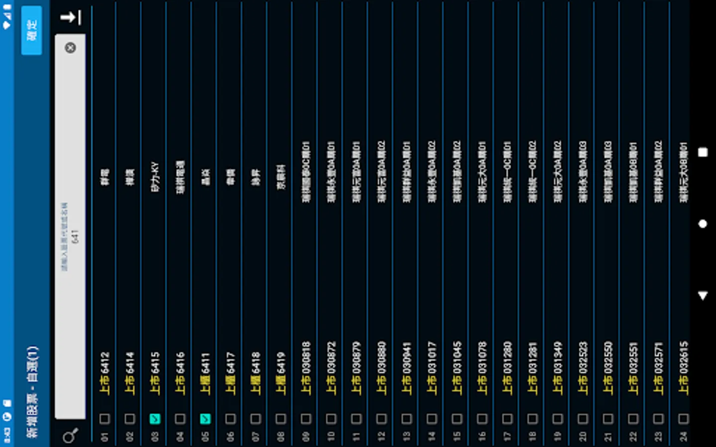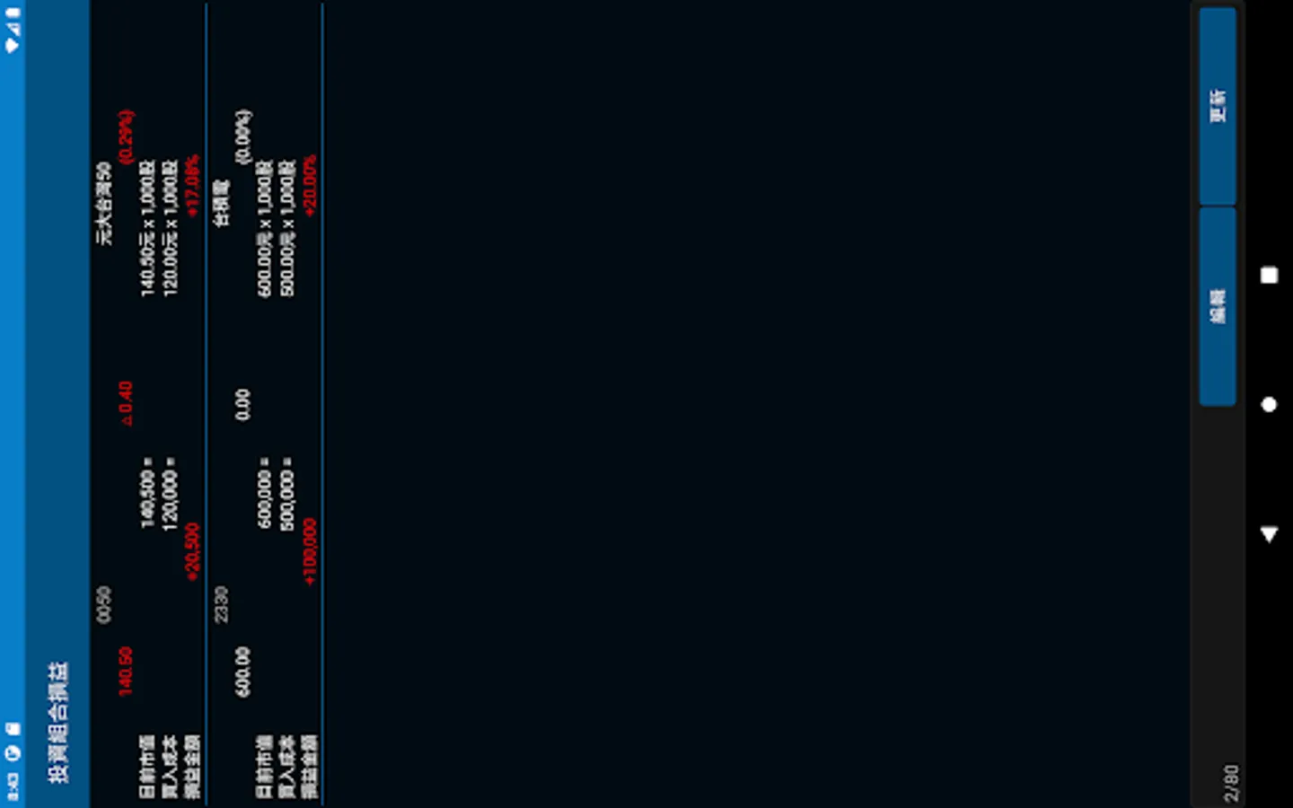 8. 6 self-selected stock lists, each of which can support 80 stocks, for a total of 480 stocks. In addition, the investment portfolio also supports 80 stocks to calculate profit, set the price and quantity of stocks to buy, and calculate the profit amount and range in real time.