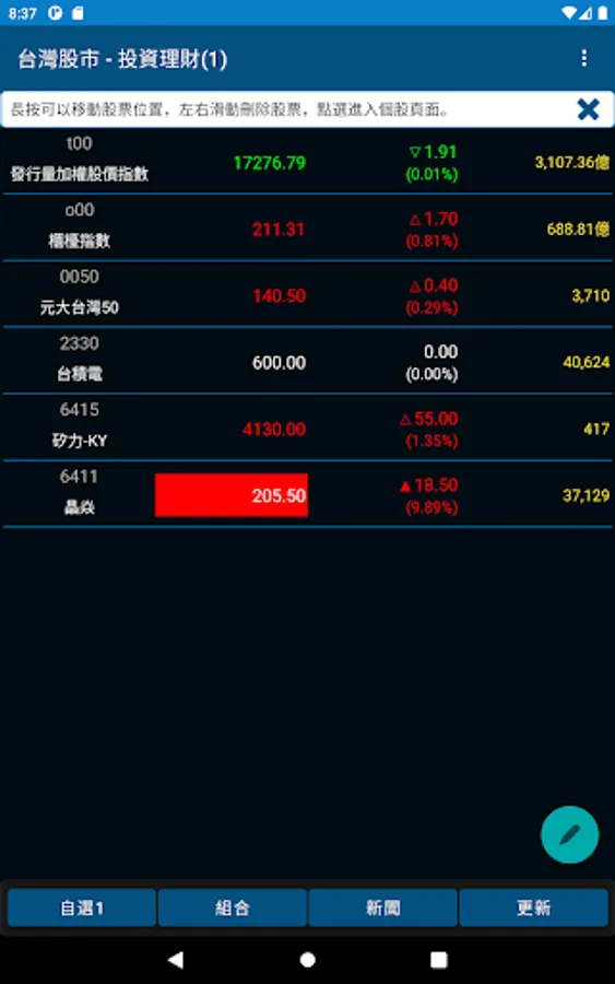 Taiwan stock market watch APP, mobile stock software, main functions include stock and ETF real-time quotation, analysis of individual stock market, technical line graph, individual stock fundamental information, calculation of investment portfolio profit, real-time weighted index and industry classification index, five-level details, Invest in financial websites, individual stock news and stock market news. The main pages all provide warm reminders on how to operate the function.