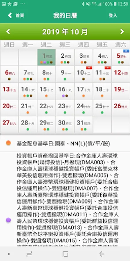 . My calendar_Insurer's exclusive policy information, the fund's dividend base date, the deadline for receipt of new coupon contracts, and public holidays announced by the Administrative Bureau of Personnel.