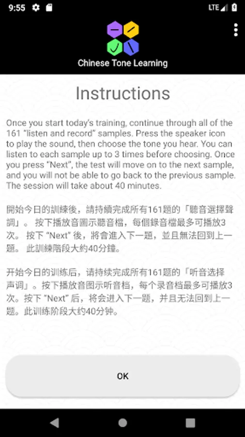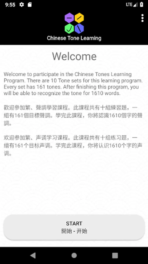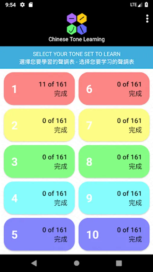 Welcome to participate in the Chinese Tones Learning Program. There are 10 Tone sets for this learning program. Every set has 161 tones. After finishing this program, you will be able to recognize the tone for 1610 words.