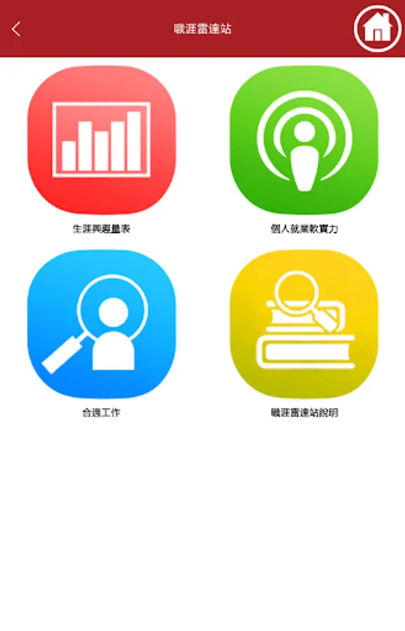 5. 職涯雷達站:行動版「職涯雷達站」,整合「個人興趣」、「能力自評」結果,查詢推薦工作職務機會。