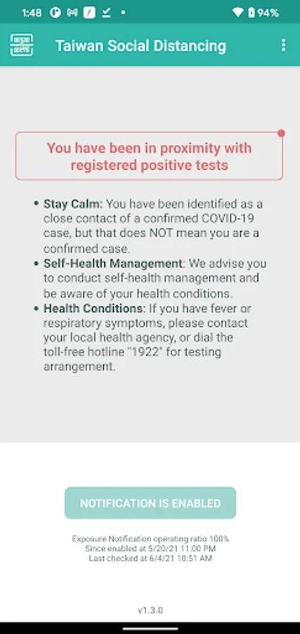 “Taiwan Social Distancing app” is developed by the Taiwan Artificial Intelligence Laboratory (Taiwan AI Labs) in collaboration with the Executive Yuan and Taiwan Centers of Disease Control (Taiwan CDC) of the Ministry of Health and Welfare. The app provides at-risk users located in Taiwan (including Penghu, Kinmen, and the Matsu archipelagoes) COVID-19 exposure notifications and follow-up instructions to contact their nearest health bureau in an effort to reduce further spread of COVID-19.