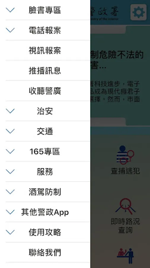 The Police Department of the Ministry of the Interior continued to improve the service quality of this App and comply with the Executive Yuan’s responsive website policy, so that the operation interface can have a holistic and consistent style, and is compatible with the operation and display of mobile phones and tablets. Re-planning and reorganizing the apps that have been put on the shelves, such as where are you the police, the police criminal record certificate, the application for traffic accident data...etc., and designed with the style of "shortcut function keys, style personalization", so that each function menu can be set, The content of the data can be flexibly adjusted according to the user's habits; in addition, in response to the current government policy that focuses on "fighting fraud" for public security, the 165 special area function is added to combine crime detection and police services to provide instant and considerate police services. It provides functions, categorized as follows:
