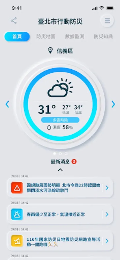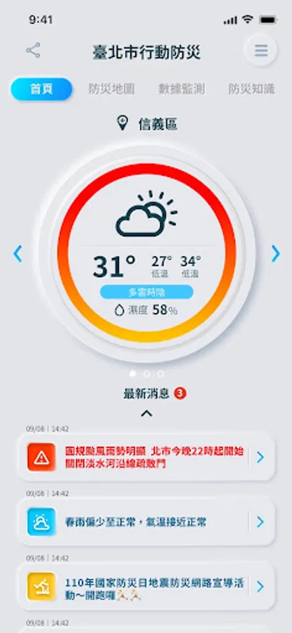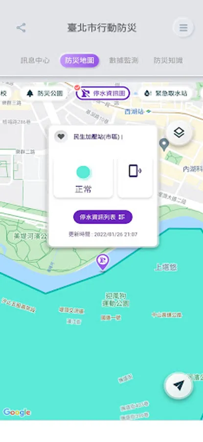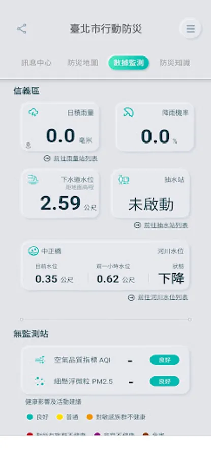 In addition to the real-time weather information (rainfall, water conditions and typhoon warnings), work and class suspension information, surveillance images, medical institutions, disaster prevention parks and disaster prevention maps, the Taipei City Disaster Prevention App provides emergency evacuation information such as disaster prevention maps in the city. The case inquiry and display function provides the public with the real-time disaster situation. At the same time, a "Follow Information" function is also designed to freely select the required information, and use colors to distinguish the rainfall intensity, so as to display and judge the rainfall in a more intuitive way. size, and achieve the function of reminder.