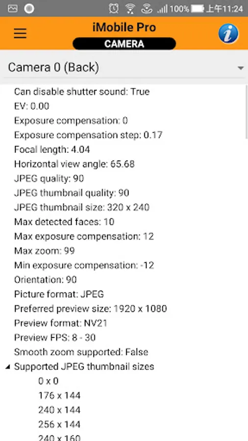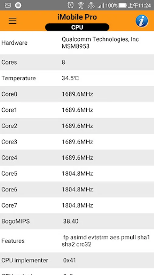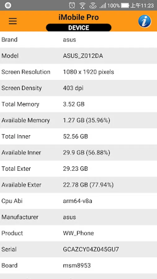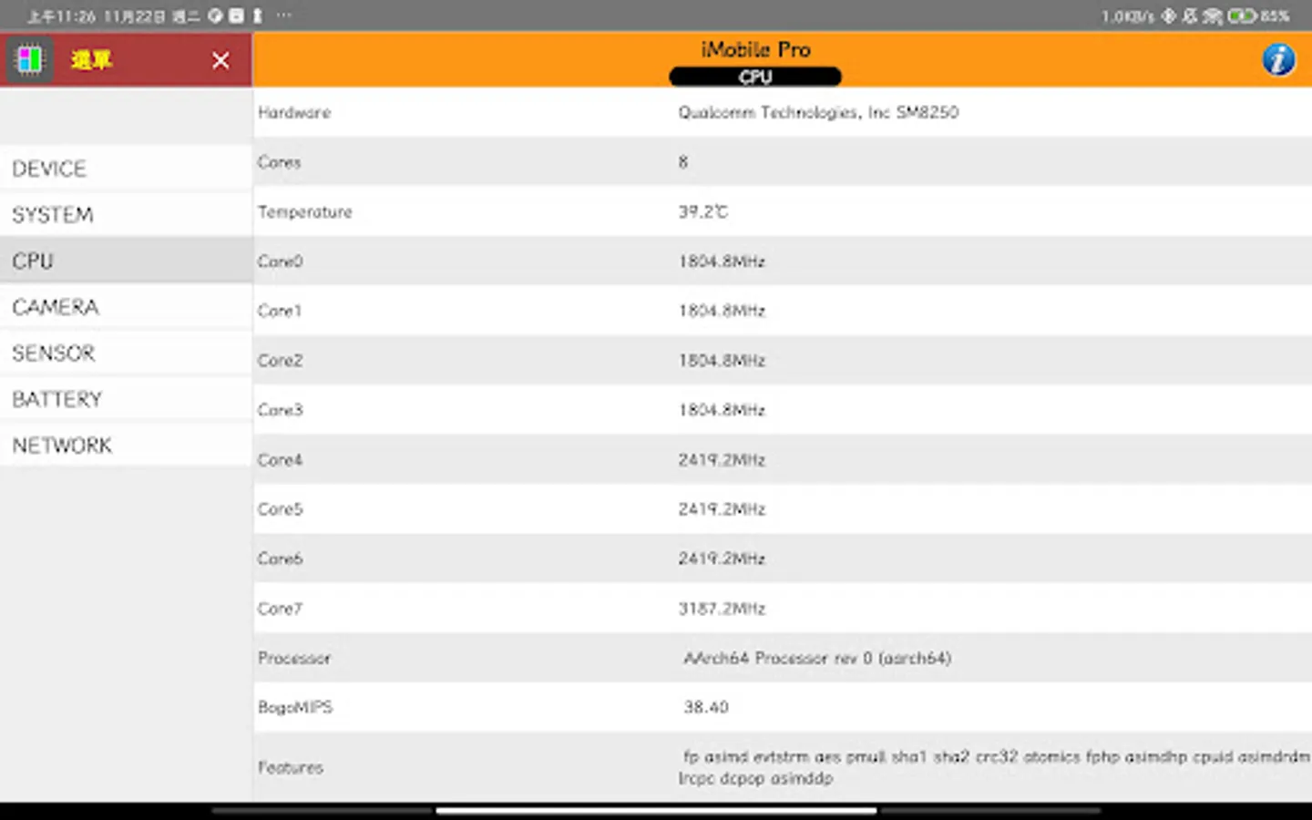 Provides viewing various specifications of your mobile phone, including Device / System / CPU / Camera / Sensor / Battery / Network...etc.