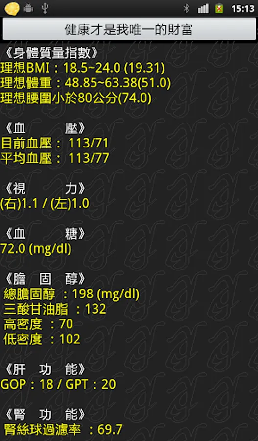 As long as you enter relevant test values, "My Health Secretary" automatically compiles and analyzes statistics and tabulations based on your gender and age, providing you with a conscientious "health summary report" in real time, allowing you to grasp your health at any time; by the way, reminding relatives and friends around you Friend "Health is the only wealth in life"