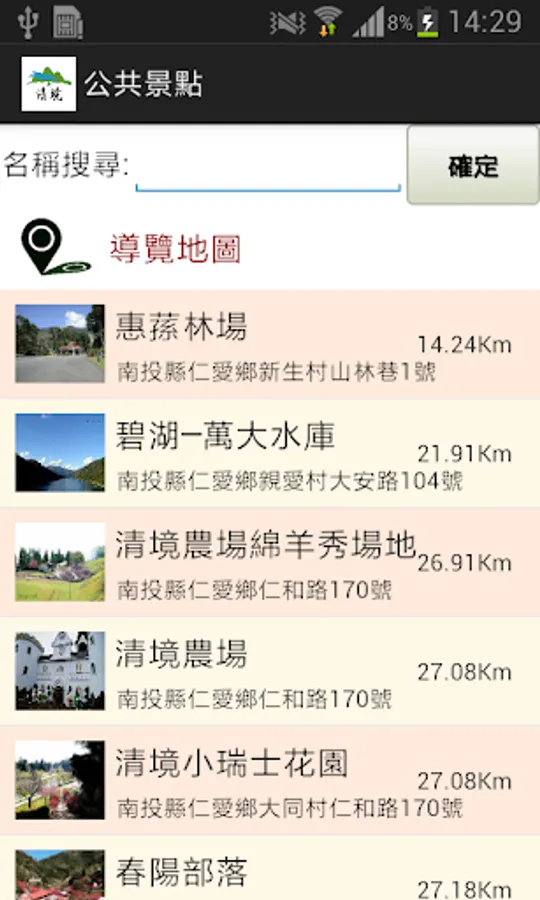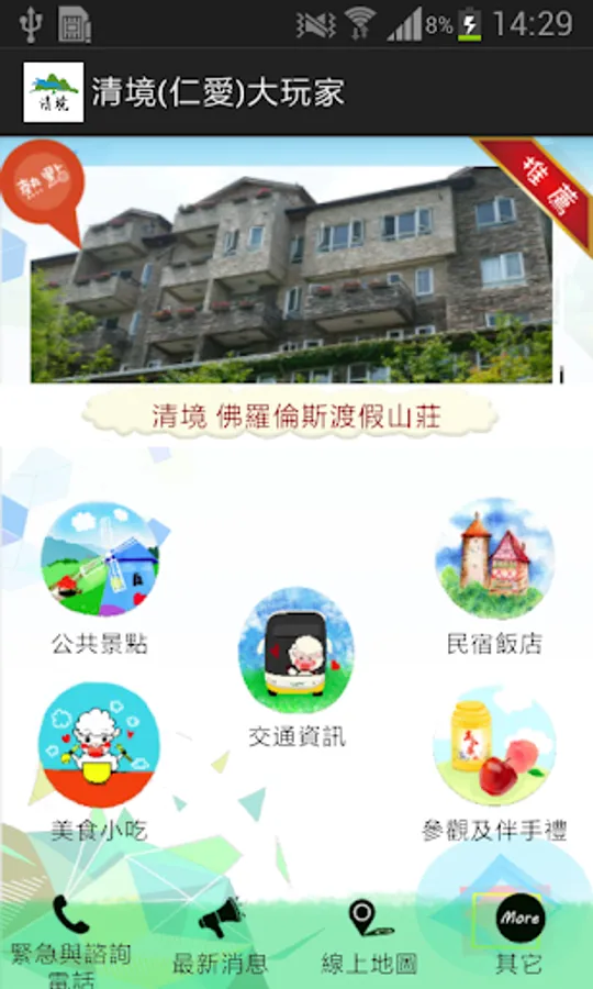 清境(仁愛)大玩家觀光導覽系統,提供您仁愛地區公共景點、民宿飯店、美食小吃、參觀及伴手禮等旅遊資料外,並提供旅遊地圖導航與景點距離排序,帶您從四個台灣機場如何搭乘各種大眾運輸車輛到達清境,本系統不只是各種旅遊資訊的提供,連派出所、醫院、加油站、便利商店都能很容易的搜尋及導航,清境(仁愛)大玩家是您在清境旅行最棒的雲端導遊。