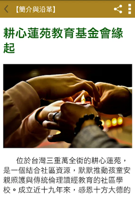耕心蓮苑教育基金會是一個推動傳統品格倫理與教養之公益組織,並且長期照顧、輔導地方經濟弱勢家庭的孩子。辦學近二十年,深受民間仕紳與政府機構之肯定與支持,曾獲新北市推動社會教育有功團體獎、行政院教育部社教公益獎等獎項。