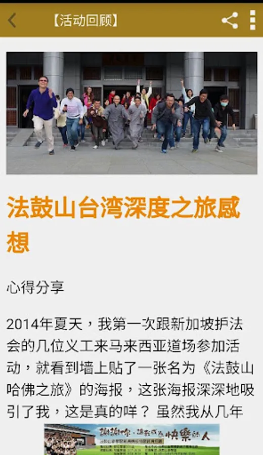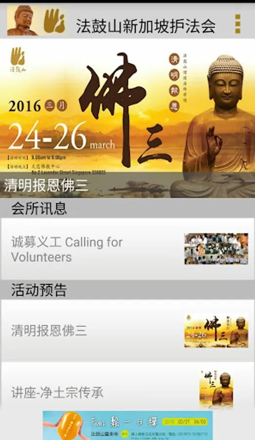 法鼓山新加坡护法会成立缘由源自一群对佛法有正信并秉持着弘扬佛法愿心的菩萨,同心协力,团结一心朝向共同的理念“提升人的品质,建设人间净土”目标前进。会所前后共搬迁了6次: