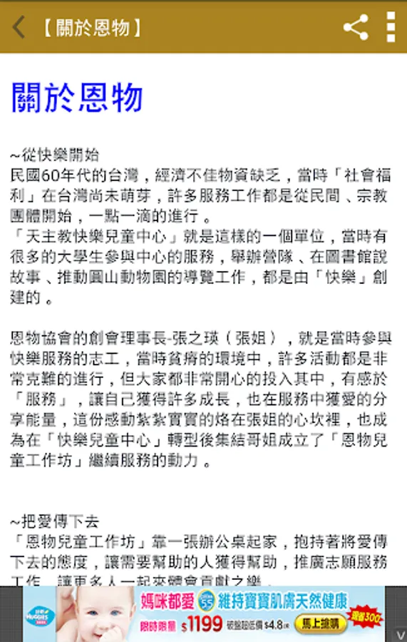 恩物」承接了前人留下的成績,持續用真心、關心、用心於我們生活的環境,秉持著「服務為優質生活」的理念,推動志願服務專業化、從「兒童」開始,實踐終身志工的概念,恩物如同種子般開創了「親子志工」、「兒童志工」等坊間少見的服務團隊,同時不斷的凝聚力量,在貧宅、社區,展現服務能量;關懷弱勢兒童、銀髮老人..等,將對社會的關注,以具體的行動傳承下去。近二十個年頭,恩物的腳步未曾停歇過,一切的努力都是希望能讓我們的環境更加美好,讓愛的種子深耕每個人的生命福田。