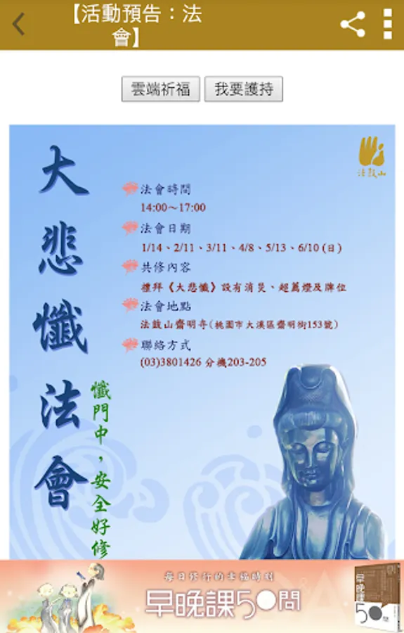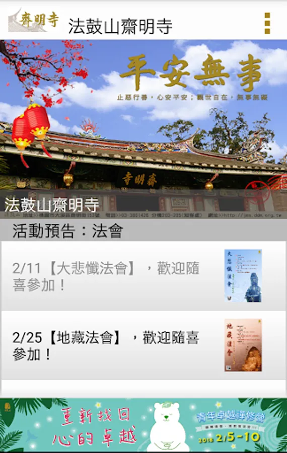 信心,也來自於運用佛法後所得的實益。為了將佛法普及到民眾日常生活中,齋明寺規畫了一系列法會共修活動、禪修、念佛、佛學課程及各項禪藝課程等,接引大眾體驗正信佛法的妙用。