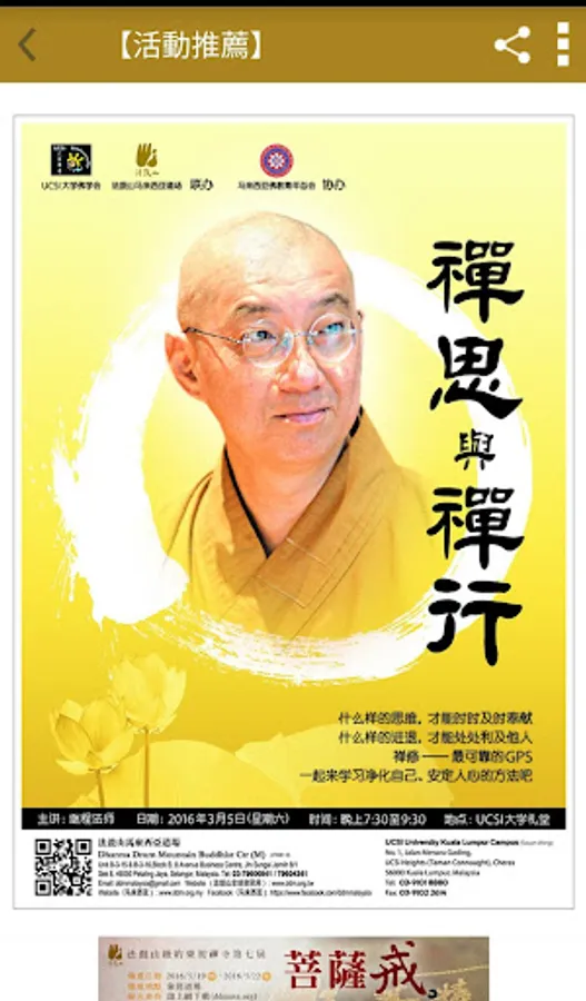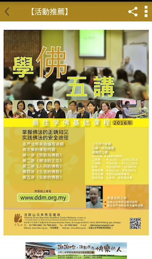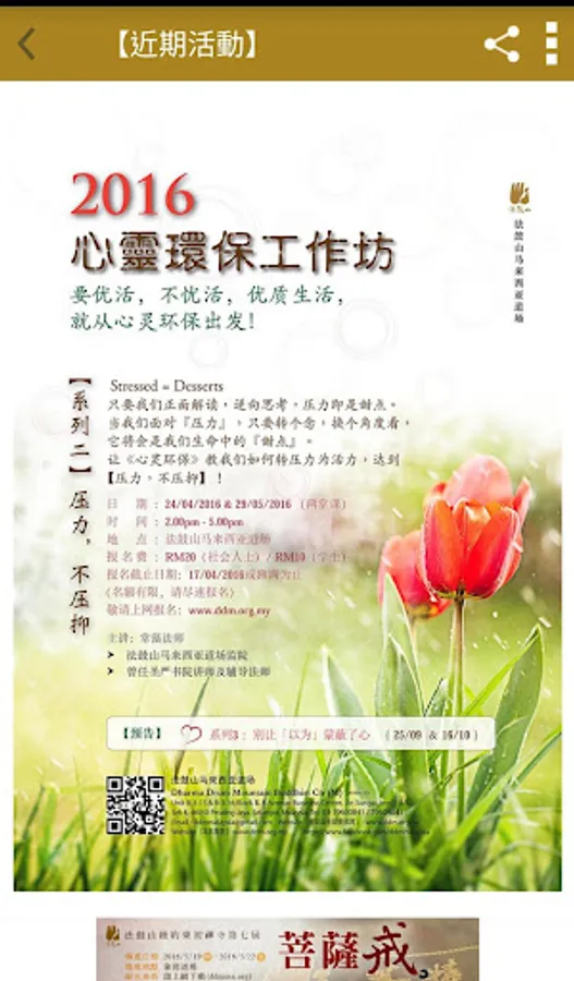 法鼓山馬來西亞道場貫徹法鼓山「心靈環保」的核心價值,推廣「禪修與教育」。藉由各類、各層面的禪修和教育活動,推廣適應現代人類倫理道德的價值與行為,達成人品提昇、建設人間淨土的目標。道場前身為「法鼓山馬來西亞禪中心」,2001年4月由聖嚴法師親自主持灑淨啟用典禮。當年聖嚴法師一圓19年的心願,首次蒞臨馬來西亞弘法五天,引起熱烈的回響。法鼓山馬來西亞道場位處八打靈再也市區中心,是一座位於都市之中安穩身心的心靈道場。目前主要舉辦活動,如:初級禪訓班、禪一、Fun鬆一日禪、舒活二日禪、禪七、青年戶外禪、學佛五講、心靈環保工作坊、兒童生命教育課程、念佛共修、佛一、大悲懺法會、觀音法會、地藏法會等等。