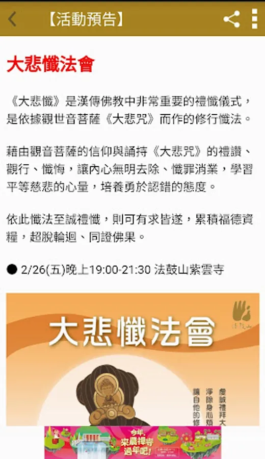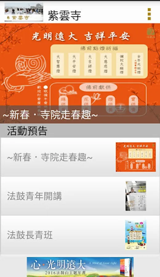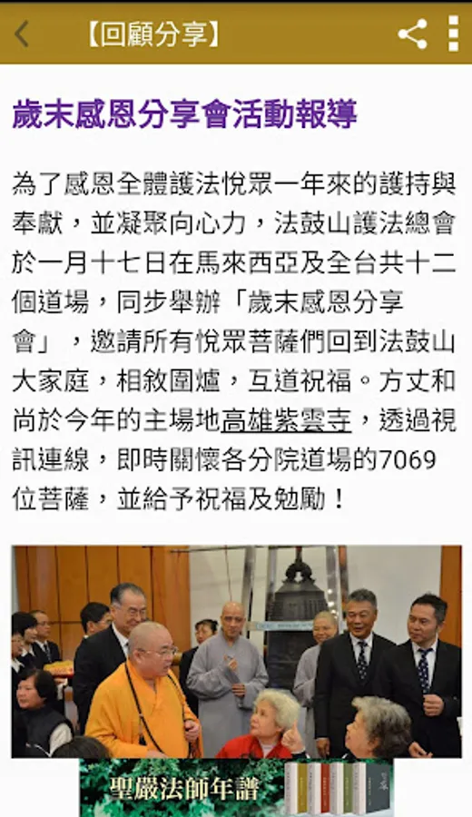 紫雲寺位於高雄市鳥松區澄清湖畔,1960年由開山住持演禪長老尼購地草創,長老尼為天臺宗高僧斌宗上人弟子,因此將紫雲寺冠上「南天臺」的宗派,名為「南天臺紫雲寺」,第二任住持為淨圓法師。2001年,演禪長老尼有鑑於自身及淨圓法師年事皆已高,為使法務永續、正法弘揚,故力邀法鼓山承接紫雲寺的法務工作。 法鼓山自接續法務後,歷經兩年餘的建設與努力,於2003年3月1日舉行新建大樓啟用暨佛像開光祈福法會、新舊任住持暨管理人交接典禮,前任住持淨圓法師移交印信,由聖嚴法師擔任第三任住持,期許將紫雲寺發展為南臺灣心靈環保重鎮,發揮淨化人心、淨化社會的功能,引導社會大眾一起建設人間淨土。淨圓法師並依止聖嚴法師為弟子,法名為果淨。 紫雲寺定期舉辦:經典共修、念佛共修、菩薩戒誦戒會、禪坐共修等;初級禪訓班、禪一、大悲懺法會、各項節慶法會;佛學講座、成長課程、營隊等,致力推廣法鼓山理念,期能接引更多大眾親近佛法。