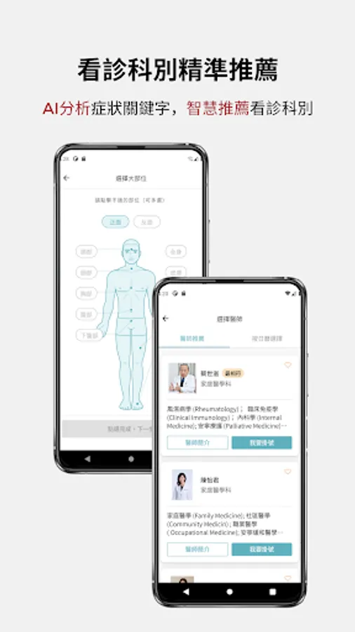 【AI department recommendation】 According to the age, gender, and discomfort area input by the user, the advanced AI technology is used to analyze the symptom keywords, match the medical big data database, recommend possible symptom sets, and recommend the medical department based on this.
