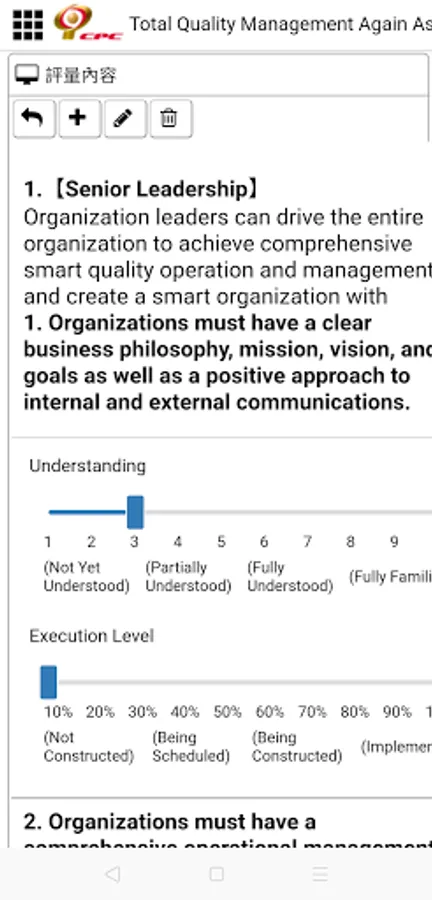 This Assessment measures an organization's operation management level in the era of smartization according to the spirit of TQM Again. The Assessment results are intended to assist organizations to achieve comprehensive operational excellence and master the applications needed in response to future smart trends. The Assessment has 4 aspects ("Executive Leadership," "Customer Orientation," "Full Participation," and "Continuous Improvement") and 16 questions. The self-assessment provides the organization with the best transformation, upgrade direction, and path reference for achieving "TQM" and creates the best management quality benchmark for sustainable organization operation through steady, clear, and efficient steps.