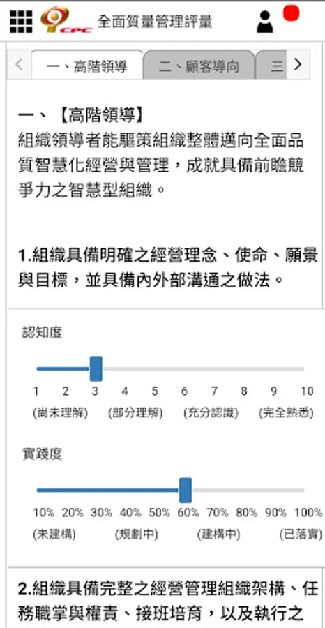 1. From the perspectives of "senior leadership", "customer orientation", "full participation", "continuous improvement", etc., provide organizations with an assessment of "awareness" and "practice".