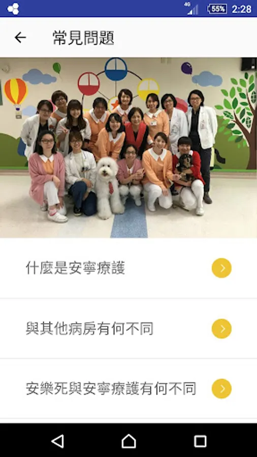 馬偕安寧療護教育示範中心為一個多元專科背景的照顧場域,主治醫師來自腫瘤專科、家醫科、甚至是精神科。馬偕安寧秉持此初衷,愛人如己,陪病人與家屬一起走人生的最後一哩路。提供安寧療護APP讓有需要的民眾能快速查閱馬偕安寧療護服務模式、收案標準、環境介紹及多國語之照護技巧…等內容。