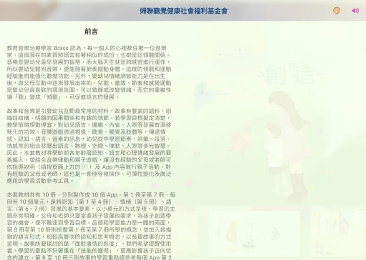 故事和音樂是引發與幼兒互動最常用的材料,故事有豐富的語料、組織性結構、明顯的因果關係和有趣的情節,若學習目標擬定清楚,教學策略規劃得宜,對幼兒語言、邏輯、內省、人際等發展有潛移默化的功效。音樂遊戲透過視覺、聽覺、觸覺及肢體等,傳遞情感、認知、語言、音素的訊息,幼兒從中學習節奏、詞彙、段落、情感等的組合發展出語言、數理、空間、律動、人際等多元智慧。因此,本套教材將學齡前各年齡層認知、語言和心理情緒發展的要素編入,並結合音樂律動和親子遊戲,讓沒有經驗的父母或老師可依指導說明及App內容進行親子活動。對有經驗的父母或老師,這也是一套極容易操作、可彈性變化及廣泛應用的學習活動參考工具。