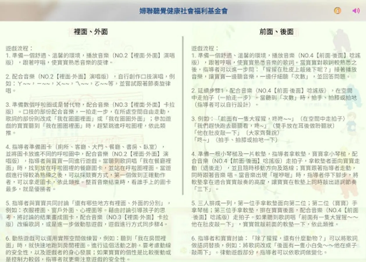 本套教材第1至7冊裡每個單元主題文字的程度,適合三歲以下的幼兒聽說跳唱,而App中人和物之間擬人化的對話,則適合三歲以上幼兒的學習或自由創造,父母和老師要引導孩子「發掘」對話內容,然後進行對話記憶、認知活動、故事創作、角色扮演等遊戲變化。對話有的有順序性,有的則沒有,只要用心就能創造出更多更有趣的教學內容。