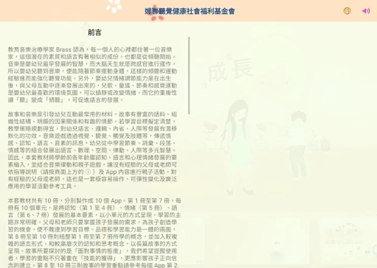 故事和音樂是引發與幼兒互動最常用的材料,故事有豐富的語料、組織性結構、明顯的因果關係和有趣的情節,若學習目標擬定清楚,教學策略規劃得宜,對幼兒語言、邏輯、內省、人際等發展有潛移默化的功效。音樂遊戲透過視覺、聽覺、觸覺及肢體等,傳遞情感、認知、語言、音素的訊息,幼兒從中學習節奏、詞彙、段落、情感等的組合發展出語言、數理、空間、律動、人際等多元智慧。因此,本套教材將學齡前各年齡層認知、語言和心理情緒發展的要素編入,並結合音樂律動和親子遊戲,讓沒有經驗的父母或老師可依指導說明及App內容進行親子活動。對有經驗的父母或老師,這也是一套極容易操作、可彈性變化及廣泛應用的學習活動參考工具。