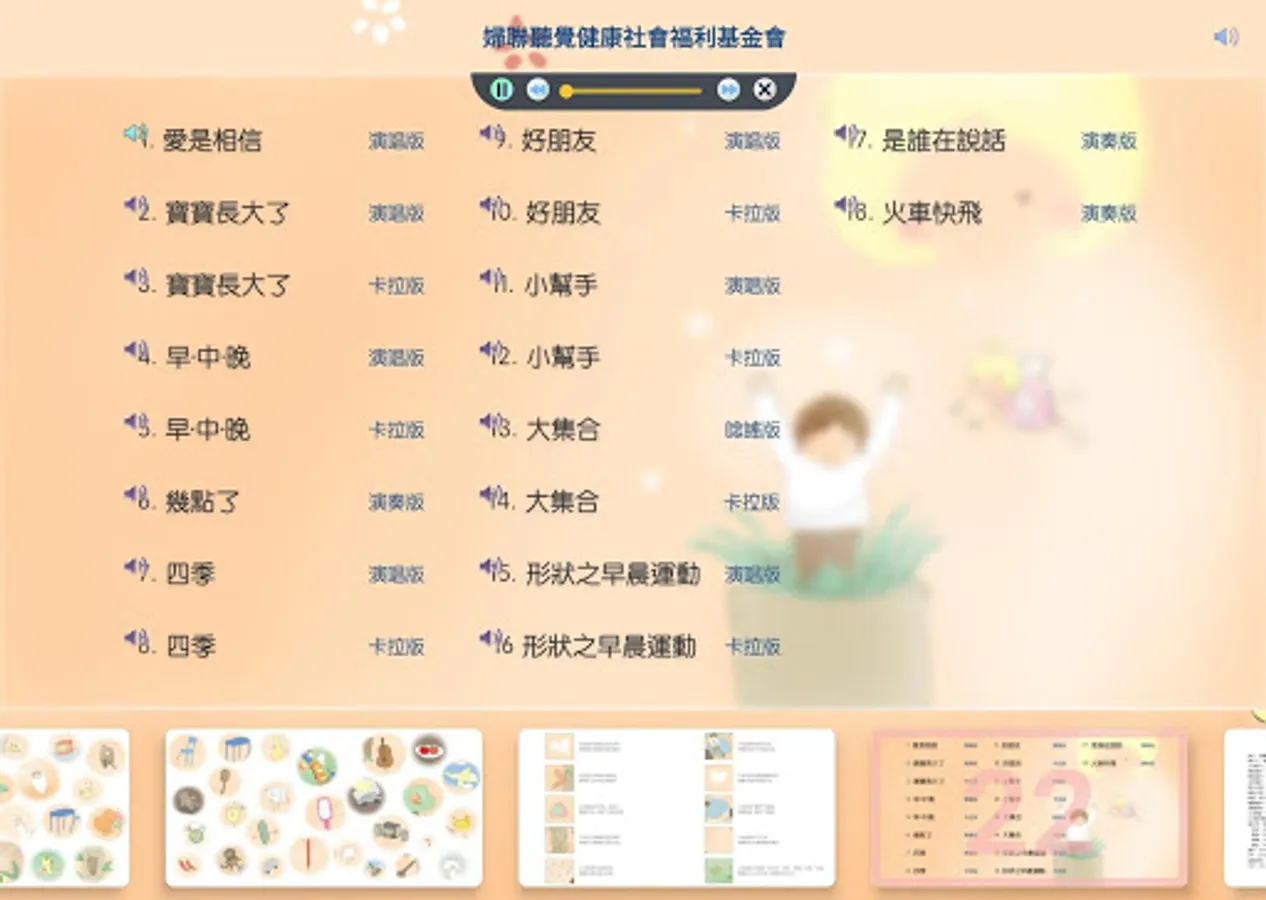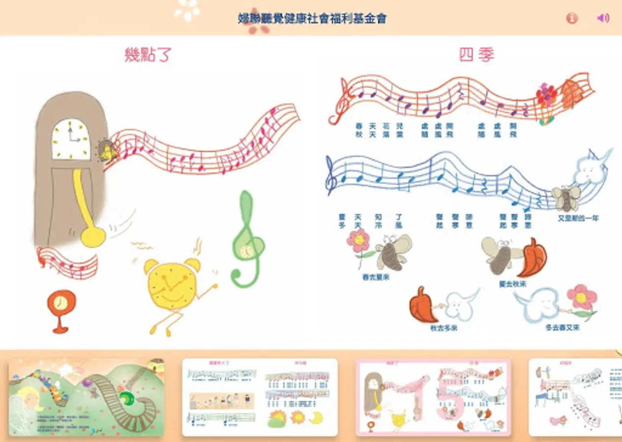 每個單元除了認知、語言的學習之外,本會特聘專業老師的音樂創作和編曲也是由淺入深、由簡至繁,配合認知、語言的內容創作或編作一首曲子。有的用唱的、有的用唸的、有的則要請使用者用心聆聽樂曲的變化。至於故事的部份,則是依內容情境作曲、配樂,再加上各式音效,使故事聽起來更加生動活潑。每首曲子都附有樂譜,夏老師用繽紛的顏色、有趣的構圖,將嚴肅的五線譜變成音樂般跳躍在讀者眼前。有些樂譜做了完整和各小節分割的兩種處理,可以很有彈性地設計各種聆聽、察覺、分辨、比較、記憶、聯想等聽覺遊戲。教材的主題曲「愛是相信」,在第1冊至第7冊的開始都會聽到,它的樂譜則是安排在第8冊、第9冊和第10冊裡。
