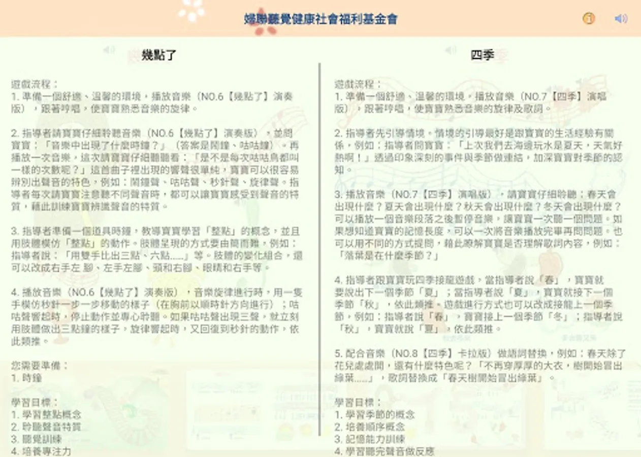 音樂是嬰幼兒最早發展的智慧,而大腦天生就是跨感官進行運作,所以嬰幼兒聽到音樂,便能隨著節奏擺動身體,這樣的傾聽和運動經驗進而能強化聽覺功能。另外,嬰幼兒情緒調節能力是在出生後,與父母互動中逐漸發展出來的,兒歌、童謠、節奏和感覺運動是嬰幼兒最喜歡的環境氛圍,可以鎮靜或改變情緒,而它的重複性讓「聽」變成「傾聽」,可促進語言的發展。