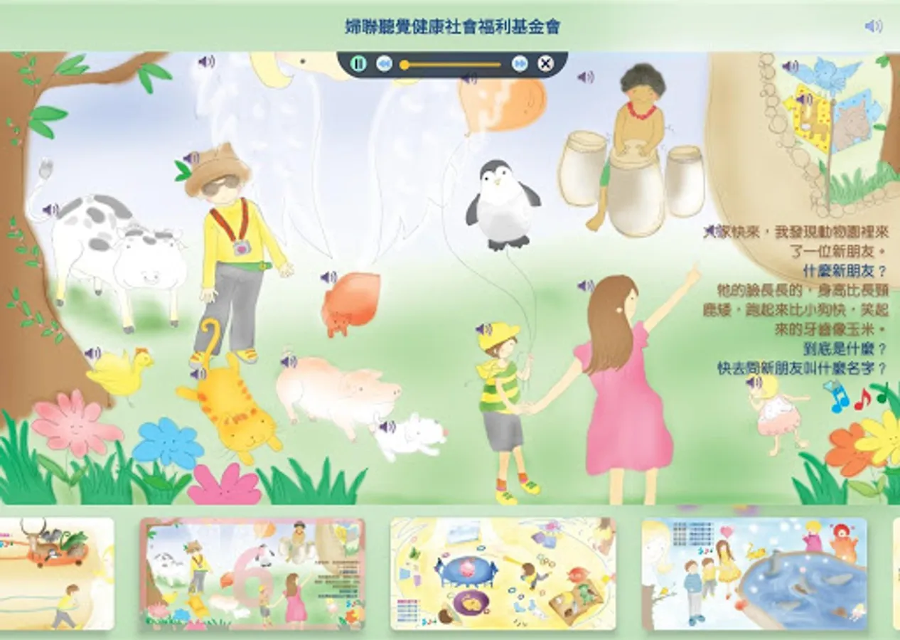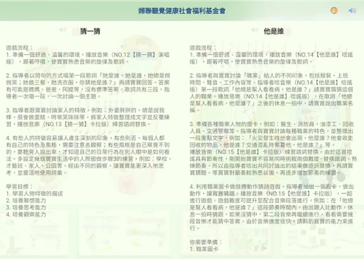 本套教材第1至7冊裡每個單元主題文字的程度,適合三歲以下的幼兒聽說跳唱,而App中人和物之間擬人化的對話,則適合三歲以上幼兒的學習或自由創造,父母和老師要引導孩子「發掘」對話內容,然後進行對話記憶、認知活動、故事創作、角色扮演等遊戲變化。對話有的有順序性,有的則沒有,只要用心就能創造出更多更有趣的教學內容。