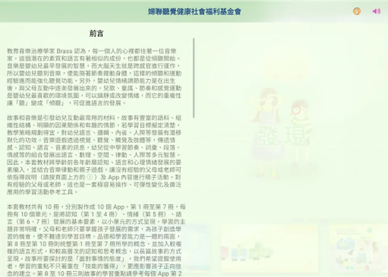 本套教材共有10冊,分別製作成10個App。第1冊至第7冊,每冊有10個單元,是將認知(第1至4冊)、情緒(第5冊)、語言(第6、7冊)發展的基本要素,以小單元的方式呈現,學習的主題非常明確,父母和老師只要掌握孩子發展的需求,為孩子創造學習的機會,便不難達到學習目標。品德和學習能力是一體的兩面,第8冊至第10冊則統整第1冊至第7冊所學的概念,並加入較複雜的語言形式,和較高層次的認知和思考概念,以長篇故事的方式呈現。故事所要探討的是「面對事情的態度」,我們希望提醒使用者,學習的重點不只著重在「技能的獲得」,更應影響孩子正向信念的建立。第8至10冊三則故事的學習重點請參考每個App第2頁的說明(請按頁面上方的「i」)。