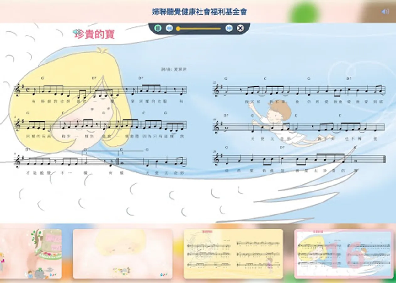 每個單元除了認知、語言的學習之外,本會特聘專業老師的音樂創作和編曲也是由淺入深、由簡至繁,配合認知、語言的內容創作或編作一首曲子。有的用唱的、有的用唸的、有的則要請使用者用心聆聽樂曲的變化。至於故事的部份,則是依內容情境作曲、配樂,再加上各式音效,使故事聽起來更加生動活潑。每首曲子都附有樂譜,夏老師用繽紛的顏色、有趣的構圖,將嚴肅的五線譜變成音樂般跳躍在讀者眼前。有些樂譜做了完整和各小節分割的兩種處理,可以很有彈性地設計各種聆聽、察覺、分辨、比較、記憶、聯想等聽覺遊戲。教材的主題曲「愛是相信」,在第1冊至第7冊的開始都會聽到,它的樂譜則是安排在第8冊、第9冊和第10冊裡。