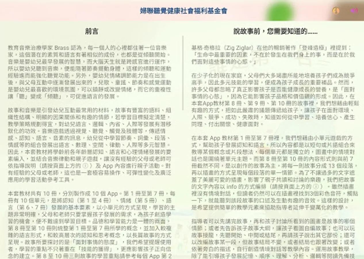 故事和音樂是引發與幼兒互動最常用的材料,故事有豐富的語料、組織性結構、明顯的因果關係和有趣的情節,若學習目標擬定清楚,教學策略規劃得宜,對幼兒語言、邏輯、內省、人際等發展有潛移默化的功效。音樂遊戲透過視覺、聽覺、觸覺及肢體等,傳遞情感、認知、語言、音素的訊息,幼兒從中學習節奏、詞彙、段落、情感等的組合發展出語言、數理、空間、律動、人際等多元智慧。因此,本套教材將學齡前各年齡層認知、語言和心理情緒發展的要素編入,並結合音樂律動和親子遊戲,讓沒有經驗的父母或老師可依指導說明及App內容進行親子活動。對有經驗的父母或老師,這也是一套極容易操作、可彈性變化及廣泛應用的學習活動參考工具。