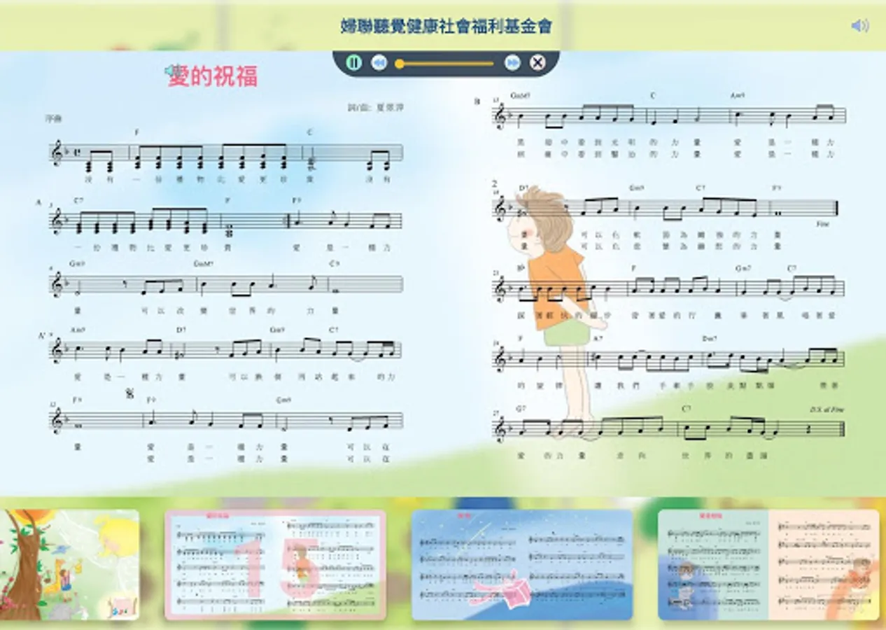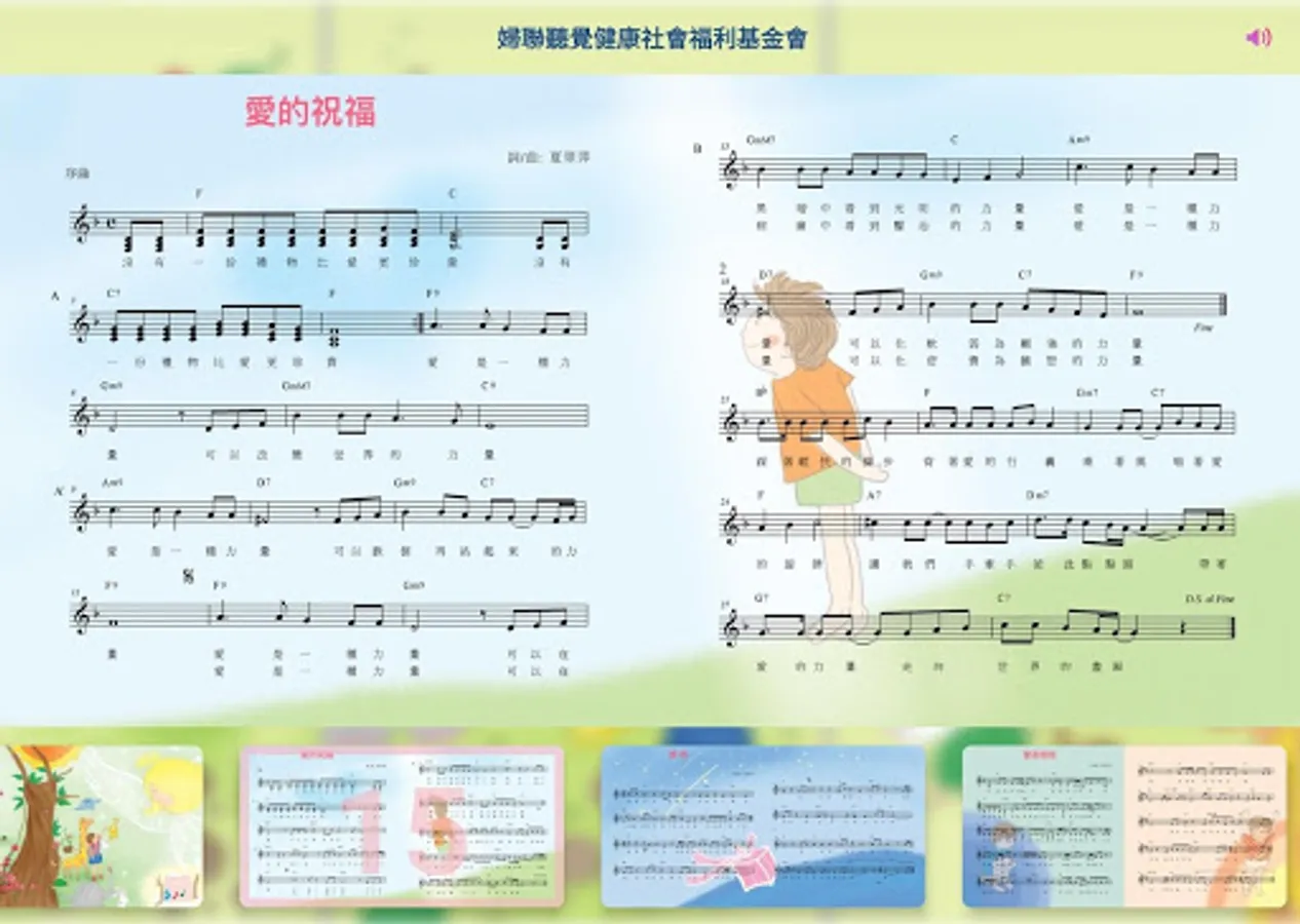 每個單元除了認知、語言的學習之外,本會特聘專業老師的音樂創作和編曲也是由淺入深、由簡至繁,配合認知、語言的內容創作或編作一首曲子。有的用唱的、有的用唸的、有的則要請使用者用心聆聽樂曲的變化。至於故事的部份,則是依內容情境作曲、配樂,再加上各式音效,使故事聽起來更加生動活潑。每首曲子都附有樂譜,夏老師用繽紛的顏色、有趣的構圖,將嚴肅的五線譜變成音樂般跳躍在讀者眼前。有些樂譜做了完整和各小節分割的兩種處理,可以很有彈性地設計各種聆聽、察覺、分辨、比較、記憶、聯想等聽覺遊戲。教材的主題曲「愛是相信」,在第1冊至第7冊的開始都會聽到,它的樂譜則是安排在第8冊、第9冊和第10冊裡。