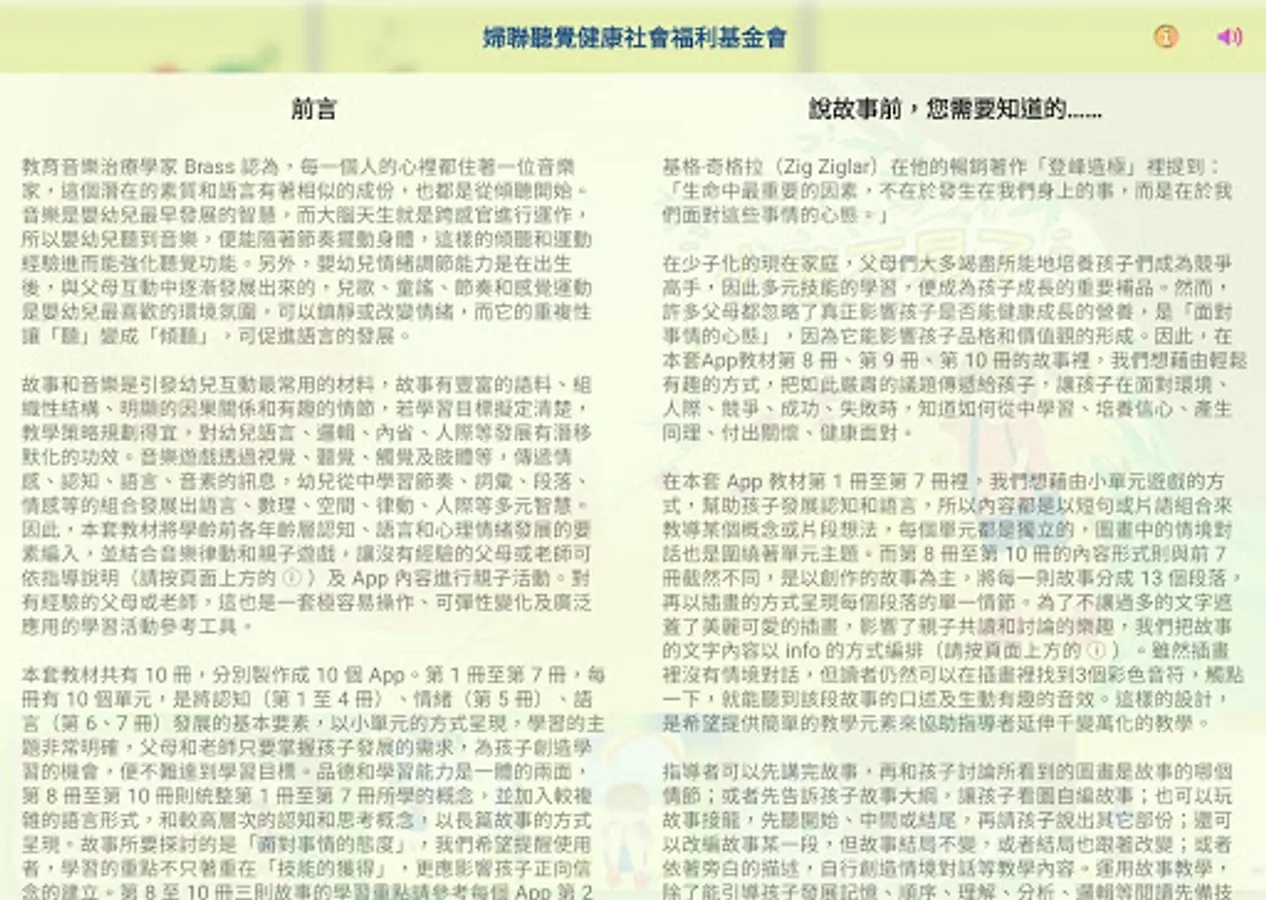 本套教材共有10冊,分別製作成10個App。第1冊至第7冊,每冊有10個單元,是將認知(第1至4冊)、情緒(第5冊)、語言(第6、7冊)發展的基本要素,以小單元的方式呈現,學習的主題非常明確,父母和老師只要掌握孩子發展的需求,為孩子創造學習的機會,便不難達到學習目標。品德和學習能力是一體的兩面,第8冊至第10冊則統整第1冊至第7冊所學的概念,並加入較複雜的語言形式,和較高層次的認知和思考概念,以長篇故事的方式呈現。故事所要探討的是「面對事情的態度」,我們希望提醒使用者,學習的重點不只著重在「技能的獲得」,更應影響孩子正向信念的建立。第8至10冊三則故事的學習重點請參考每個App第2頁的說明(請按頁面上方的「i」)。