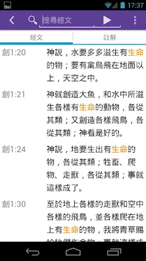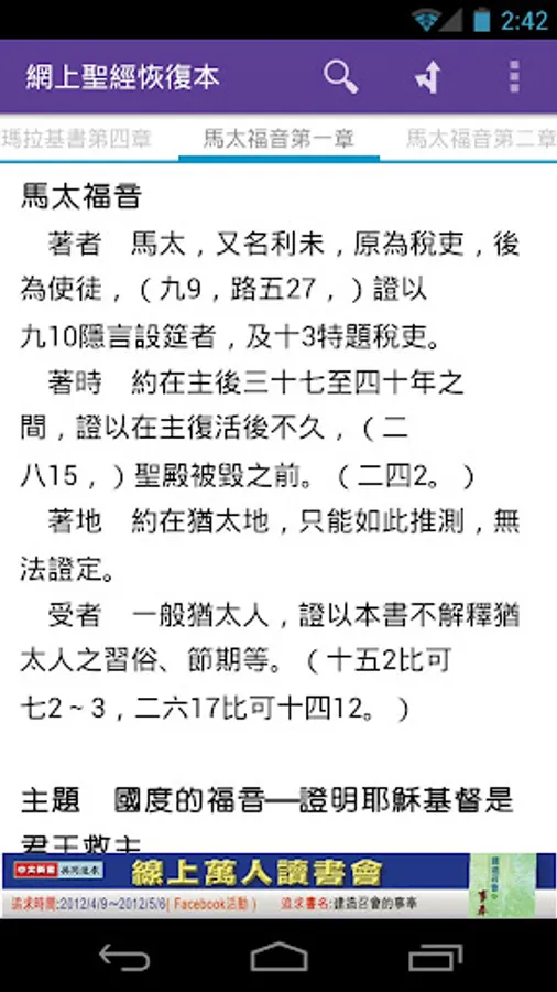 * Instructions for Purchasing: This cloud app can be downloaded for free onto Android handhelds. Verses of the whole Bible and footnotes from the four Gospels can also be read and searched for free. The option to pay $4.99 to read and search all the verses and footnotes as well as to disable the advertisement is also available.