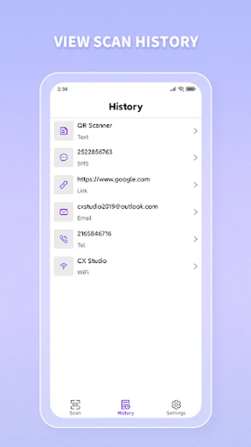 QR Scanner can read and decode all kinds of QR code and barcode, including Link, WiFi, Text, E-mail, Contact, Tel, etc.