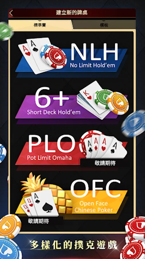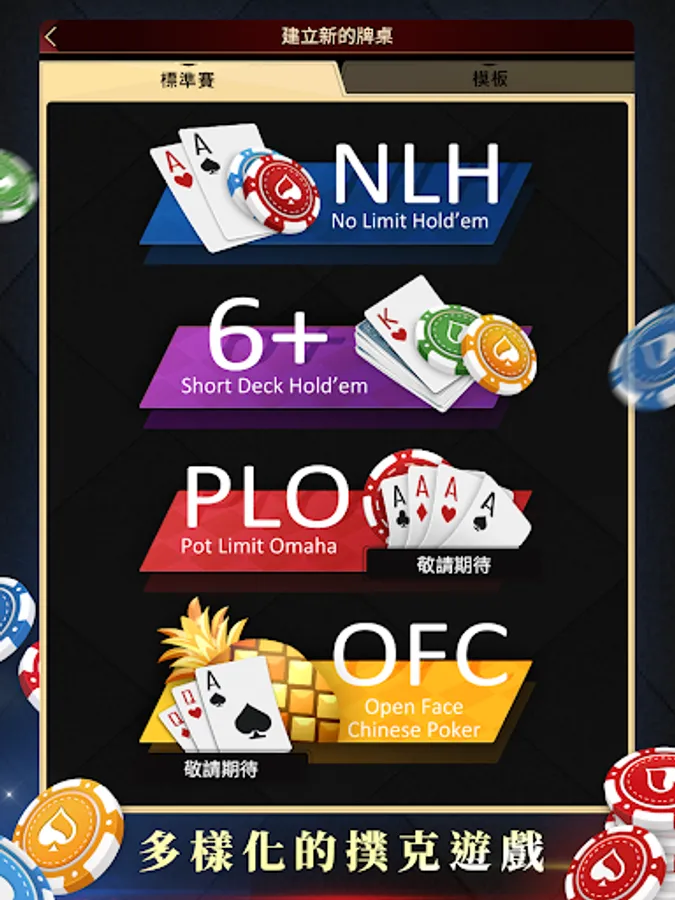 Play a variety of poker games with friends in the club, NLH (No-Limit Texas Hold'em), 6+ (Short Deck Texas Hold'em) instant fun. OFC (Big Pineapple), PLO (Omaha) and other games will also be launched one after another.