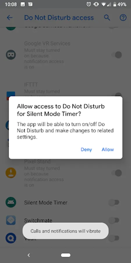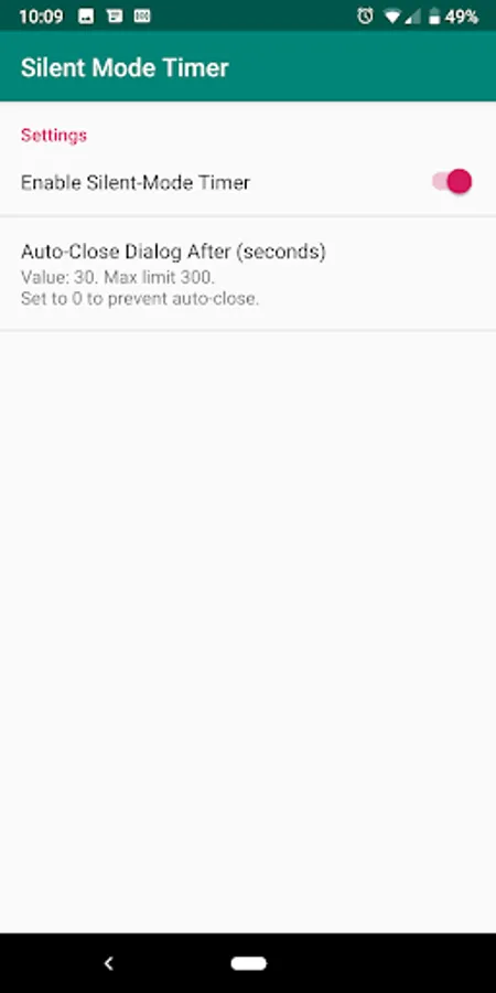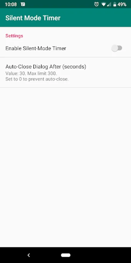NOTE: After first installing Silent Mode Timer, make sure to open the app, and toggle it "On". You can turn it off at any time, but the first time you enable it, it will ask for permission to manage your ringer settings. This is a necessary permission for the app to run.