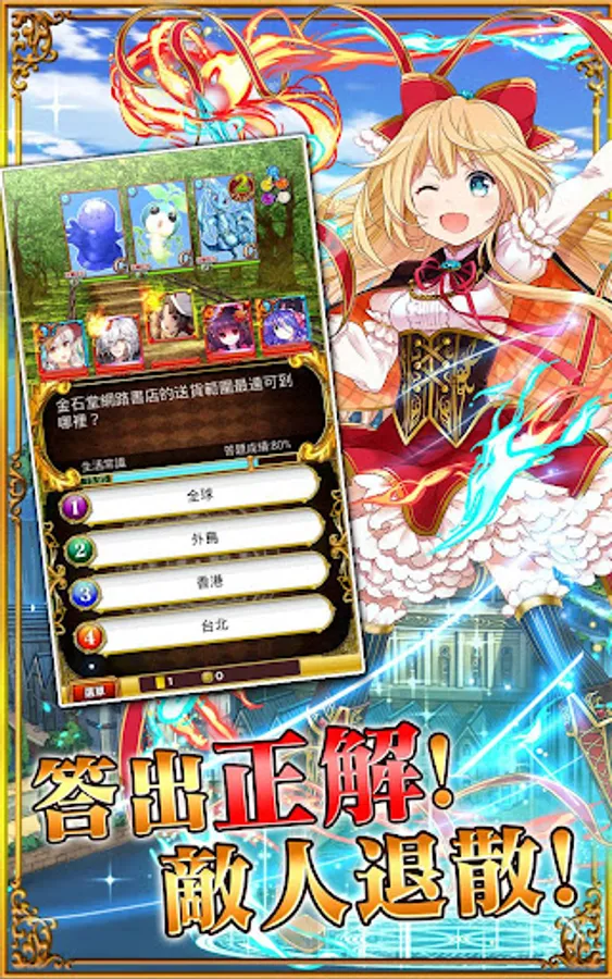 There are six types of questions for players to choose from: "Performing Arts", "Liberal Arts", "Science", "Animation and Games", "Sports", and "Life Knowledge". Correctly answering the questions will wake up the sleeping elves and give the enemy a hard blow!