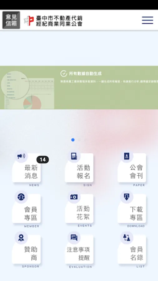 The birth and development of the Taichung City Agency Sales Association is under the guidance of the competent government agency, the exchange and guidance of the All-County Association and the National Association of County and City Associations, as well as the concerns of the building development owners and the media, and more importantly, the support and support of the members of the Association. Thank you for supporting me.