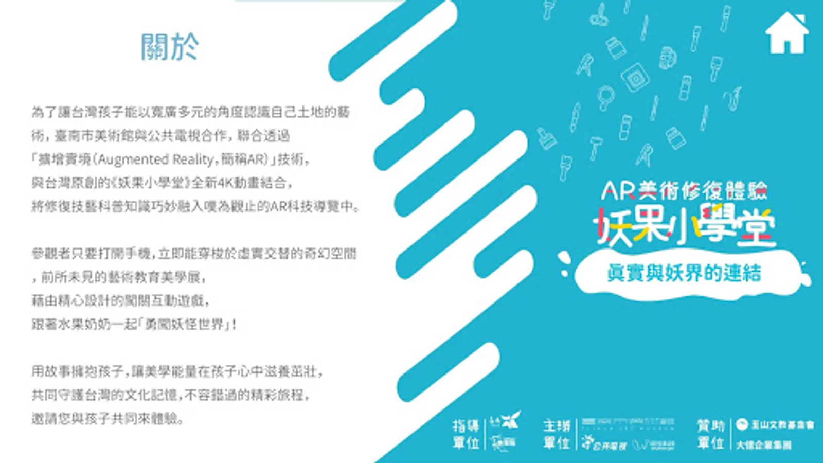 為了讓台灣孩子能以寬廣多元的角度認識自己土地的藝術,臺南市美術館與公共電視合作,聯合透過「擴增實境(Augmented Reality,簡稱AR)」技術,與台灣原創的《妖果小學堂》全新4K動畫結合,將修護技藝科普知識巧妙融入嘆為觀止的AR科技導覽中。
