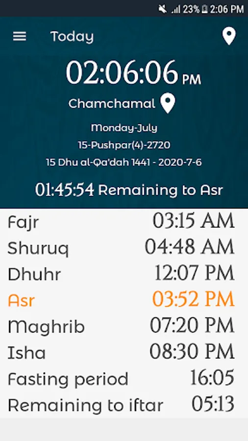 Prayer times is an android application for Muslims all around the world. Simple to use, it provides Accurate prayer times using the phone's location (latitude and longitude) based on different conventions (more than 25) and also has static time for specific regions and the direction of the Qibla , mosques locations around you , Islamic events , Ramadan and times of the night and fasting.