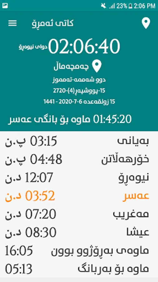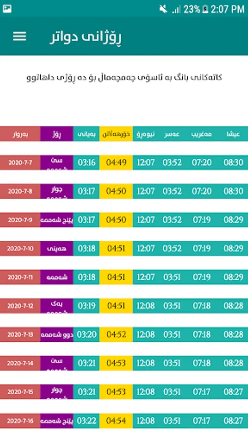 ئەپلیکەیشنەکە کاتەکانی بانگ بۆ ٣٠ ڕۆژی داهاتوو پیشان دەدات