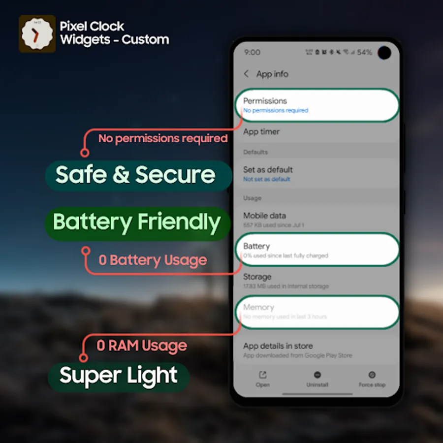 ▪︎ Pixel Clock Widgets - Custom does not collect, save, use, share, or have access to any kind of user personal information and has no mandatory required special permissions.